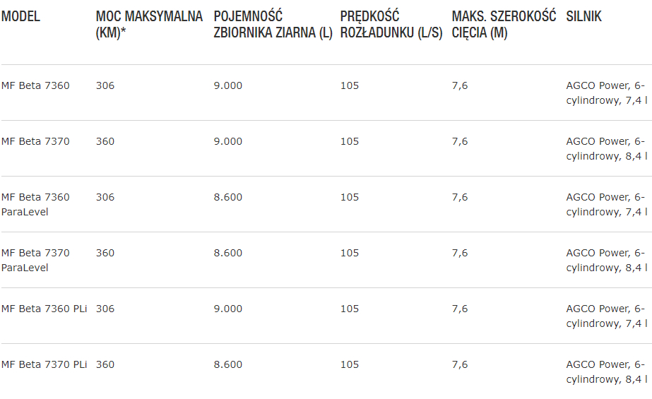 Szeroki wybór przyrządów żniwnych, opcjonalne systemy poziomowania, klepiska sekcyjne oraz wzmocnione wytrząsacze czynią z MF Beta prawdziwego mistrza uniwersalności. 306 lub 360 KM, wydajny system omłotu i separacji oraz zbiornik o pojemności 9000 litrów sprawiają, że MF Beta bez trudu pochłania kolejne hektary. Komfort pracy zapewnia bogate wyposażenie z takimi rozwiązaniami jak TechTouch, ergonomiczne rozmieszczenie elementów sterowania i doskonała widoczność.