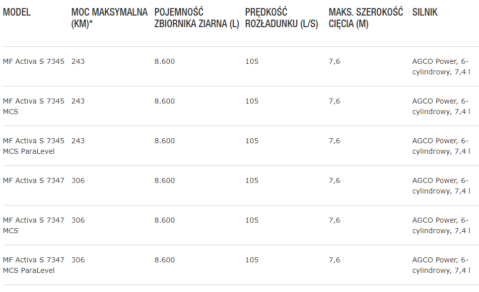 MF Activa S to niezawodność gwarantowana przez cieszący się doskonałą opinią 6 cyl. silnik AGCO Power 7,4 l. Perfekcyjna widoczność, ergonomiczna kabina i bogate wyposażenie ułatwiają pracę i zwiększają wydajność operatora. Solidny i wysokowydajny układ omłotu i separacji zastosowany w MF Activa S to klucz do szybkich i skutecznych żniw.